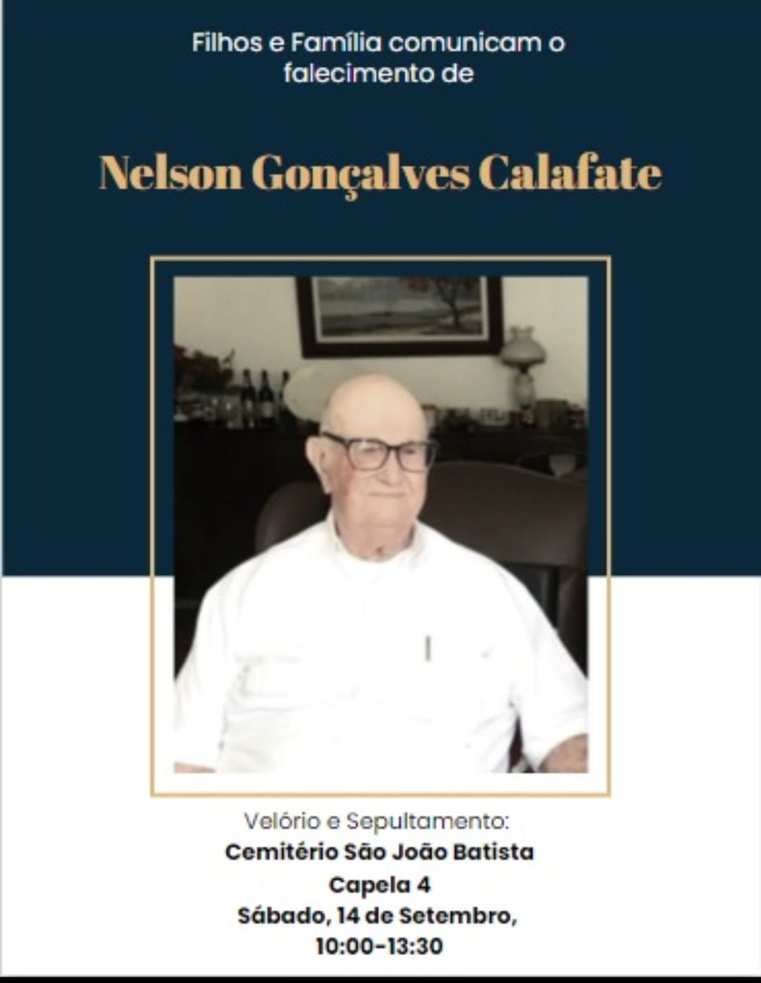 É com enorme pesar que comunicamos o falecimento do Engenheiro Químico Nelson Gonçalves Calafate. O velório ocorrerá entre as 10 -13 h deste sábado no Cemitério São João Batista, no bairro de Botafogo, no Rio de janeiro.